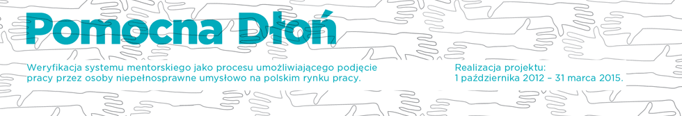Projekt „Pomocna Dłoń. Weryfikacja systemu mentorskiego jako procesu umożliwiającego podjęcie pracy przez osoby niepełnosprawne umysłowo na polskim rynku pracy” jest projektem innowacyjnym testującym, realizowanym w ramach Programu Operacyjnego Kapitał Ludzki (PO KL) ze środków współfinansowanych przez Unię Europejską. Realizacja projektu rozpoczęła się 1 października 2012 r. i planujemy jego zakończenie 31 marca 2015 r. Obecnie projekt znajduje się w fazie testowania.